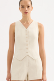 The Logan Tailored Vest is made from a viscose blend fabrication which has a dry hand feel and a slub linen yarn throughout giving a light speckled appearance. The silhouette is tailored and slim fitting with a button front opening. Features include a high v neck and Nude Lucy branded button. The vest is fully lined.